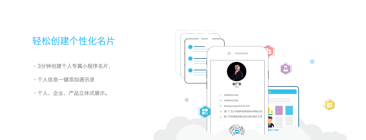 258超級(jí)名片一款懂得銷(xiāo)售,并且能主動(dòng)進(jìn)行銷(xiāo)售的社交名片,AI智能超級(jí)名片打通社交與銷(xiāo)售互通,利用數(shù)據(jù)和行為分析鎖定精_準(zhǔn)客戶(hù),通過(guò)微信流量開(kāi)啟無(wú)限商機(jī)。AI智能超級(jí)名片=小程序名片+企業(yè)信息+產(chǎn)品信息+智能存儲(chǔ)+社交連接微信10億用戶(hù)